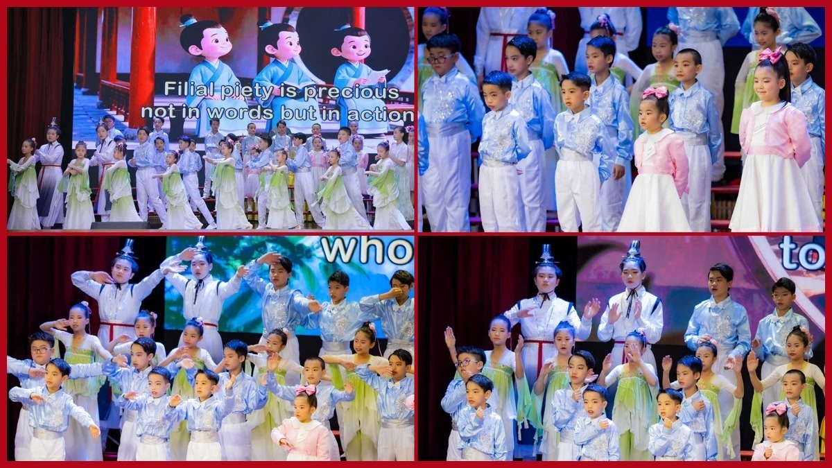 在演出過程中,孩子們不僅用歌聲詮釋《百孝經》所傳達的倫理價值,更以肢體動作與眼神交流,呈現對父母、長輩與天地的感恩之心。歌詞中反覆強調孝道是一切德行的根本,是家庭和樂、社會安定的源頭;而孩子們專注投入的表現,正是「孝由心生、行在當下」的最佳寫照。即使年紀尚小,他們已懂得以行動回應愛與教養,讓孝道不再只是文字,而成為生活中的具體實踐。